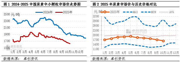 2025年国内尿素市场主流呈现“跌-涨-跌”趋势,其中三季度跌势较为明显。全年各季度特点鲜明。一季度价格先抑后扬,二季度在春耕行情支撑下,出现明显上涨后有所回落,期间价格达到年内价格相对高点,随着多地春耕收尾行情触顶回落;三季度主流行情一路震荡向下运行。卓创资讯(301299)数据监测,截至10月11日,2025年1-10月中国中小颗粒均价1804.96元/吨,较2024年均价跌15.73%。目前市场价格已经低于近10年均价,高于近10年低价。